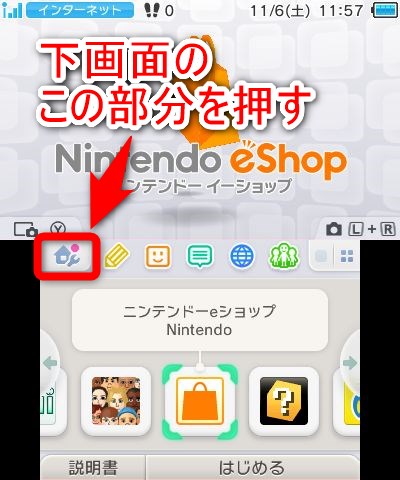 3DSで画面の明るさ(輝度)を変更するには、まず3DSのホーム画面を表示し、下画面のこの部分を押します。