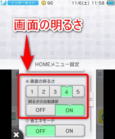 画面の明るさを変更するとすぐに3DSのディスプレイの明るさに反映されます。「明るさの自動調節」機能は、Newニンテンドー3DSおよびNewニンテンドー3DS LLで使用できる機能です。