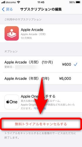 「Apple Arcade」のサブスクリプションの編集へ移動したら「サブスクリプションをキャンセルする」または「無料トライアルをキャンセルする」を選択します。