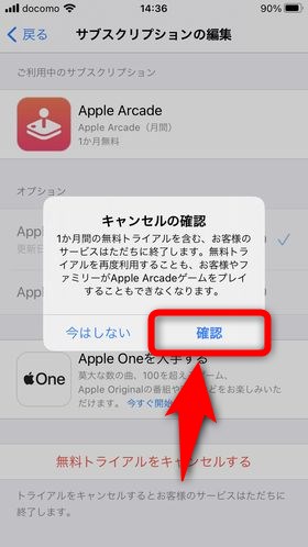 本当にキャンセルするか確認されるので「確認」を押します。以上の手順を進めればApple Arcadeを解約できます。