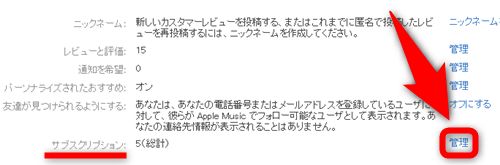 アカウント情報の画面を下にスクロールして「サブスクリプション」の項目を見つけて「管理」を押します。
