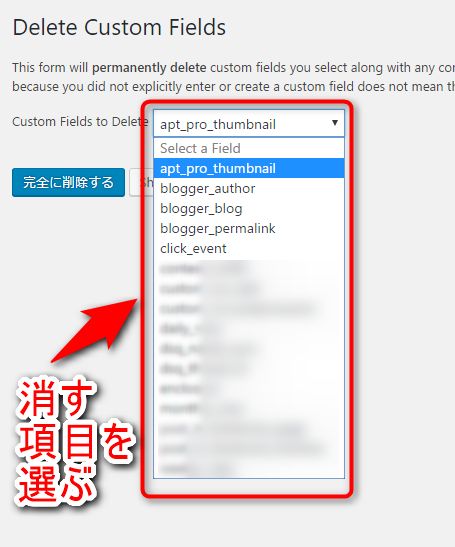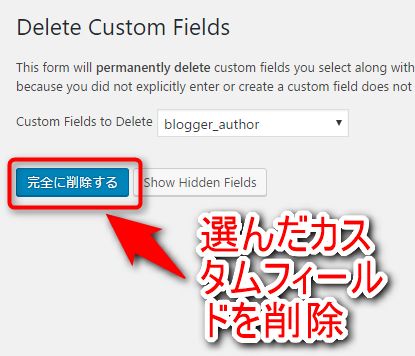 消すカスタムフィールドを選んだら、「完全に削除する」ボタンを押して、カスタムフィールドの削除を開始します。