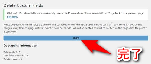 プログレスバーが100%になれば、対象のカスタムフィールドがブログの記事からまとめて削除されています。