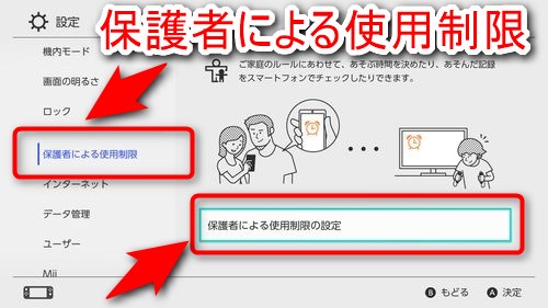 左メニューから、「保護者による使用制限」を選択し、右に出てきた項目から「保護者による使用制限の設定」を選びます。