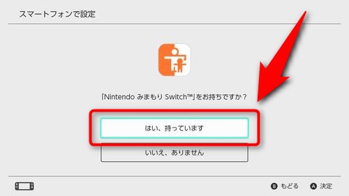 「Nintendo みまもり Switch」を持っているか聞かれるので、「はい、持っています」を選びます。