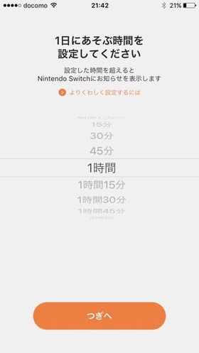 「Nintendo みまもり Switch」で管理するNintendo Switchの1日にプレイできる時間を設定します。時間を決めたら「つぎへ」を押します。
