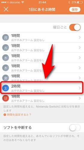 これで基本的な設定は終わりですが、1日のプレイ時間は曜日ごとに設定することも可能です。土日はゲームを多く遊びたい人は、アプリで細かく設定しておきましょう。