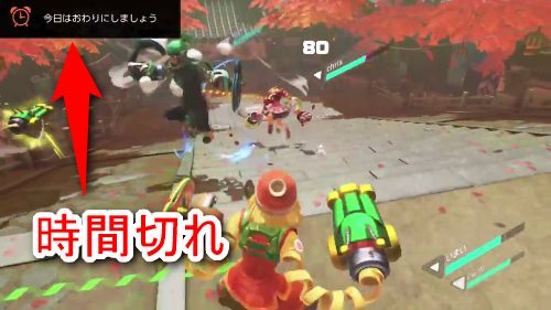 「Nintendo みまもり Switch」で、1日のプレイ時間を設定したNintendo Switchで設定した制限時間が来ると、このように画面左上に今日の制限時間を越えたことがアナウンスされます。