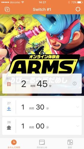 アプリの方の「Nintendo みまもり Switch」にその日のプレイ時間が反映・記録されるので、後からスマホで日々のプレイ状況を確認できます。
