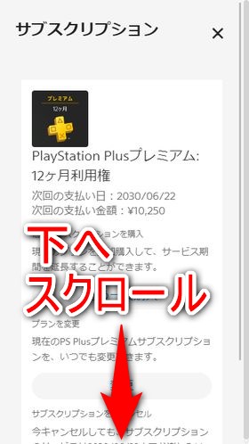 現在契約しているPS Plusの情報が表示されます。画面を下にスクロールして下さい。