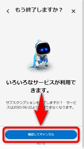 サービス解約引き止めメッセージの下に「確認してキャンセル」ボタンがあるので押します。