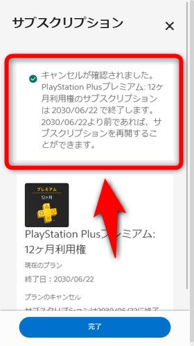 無事解約(自動更新停止)手続きが終わるとこのような表示が出ます。以上の手順で加入中のPS Plusのプランの自動更新を停止(解約)できます。