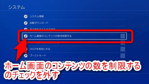 これで、PS4のホーム画面のコンテンツエリアで表示されるゲーム(コンテンツ)の数の上限が無くなります。