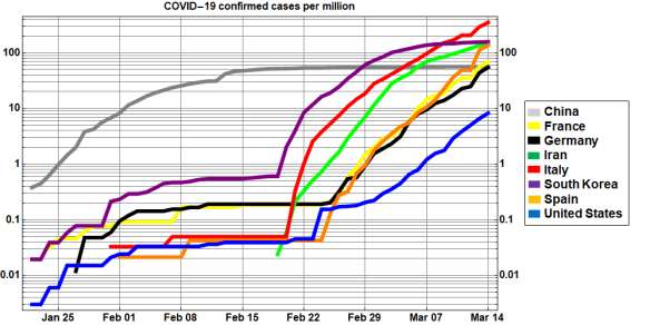Although it’s interesting to try to interpret this view of past history, I think it’s difficult to use it to predict even the near future. Note how similar is the exponential growth (note the figure is on a logarithmic scale) for, well, pretty much everyone but China and South Korea, who appear to have taken the most drastic-but-apparently-successful measures to contain the virus. Comparing with Italy, which is now struggling with hospital capacity, we here in the United States appear to be on our way to very similar numbers of cases in a matter of 11 days or so, assuming recent growth continues.