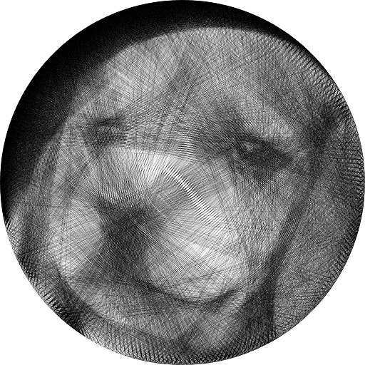 Initially, the output image “canvas” is all white. Starting at an arbitrary pin, we iteratively select the best next pin to wind the thread across. For each candidate chord, we use Bresenham’s algorithm to visit each pixel on the chord. The score for that chord is simply the average– over each of the intersected blocks that would change as a result– of the difference between the target gray level of the input pixel and the (potential) new fraction of black pixels in the block. Intuitively, we measure how important it is to continue to darken the intersected blocks of pixels.