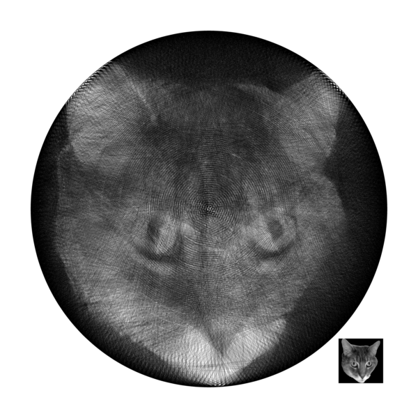 As far as I can tell, the first realization of this particular idea was in 2016, when artist Petros Vrellis [1] arranged 200 pins evenly spaced around a 28-inch-diameter circular rim, and wound kilometers of thread stretched in straight line chords from one pin to the next, in a carefully determined order, to yield an image similar to the one shown below (created by me).
