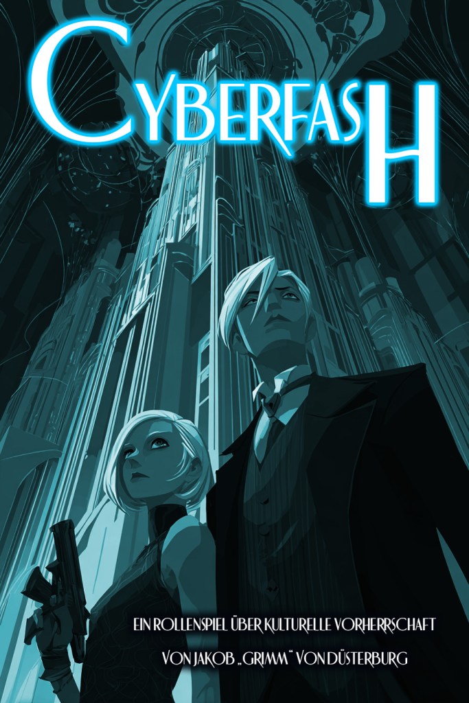Cyberfash is set in an alternative 1980s where superior Teutonic-Aryan technology has tamed the world, but in which heroic secret police squads are ever-vigilant against parasites, mutants, dissidents, counter-revolutionaries, and other dangers. Set against the backdrop of monumental neo-classical and Art Deco cities, stylish and genetically superior agents apply style and violence in support of the corporate total-state.