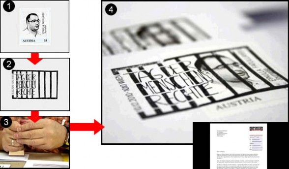 同団体はまずジャーナリストが描かれた切手を新しく発行し、一般市民に送付する寄付を募るためのダイレクトメールに使用。この手紙は郵便局にて、“牢屋の鉄格子にみえるデザイン”の消印スタンプが切手に押されるようになっていました。