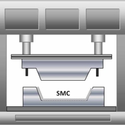 Procédés de fabrication de pièces en matériaux composites, par exemple de préimprégnés par SMC (Sheet Molding Compound), ou BMC (Bulk Molding Compound).