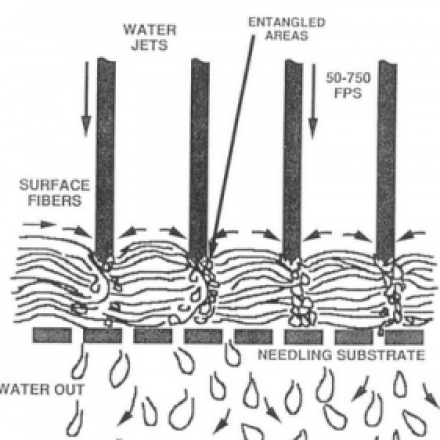 L’hydroliage, ou liage par jets d’eau, reprend le même principe que l’aiguilletage, à savoir l’enchevêtrement physique de fibres sans utilisation de liant ou d’adhésif, pour produire un non-tissé.