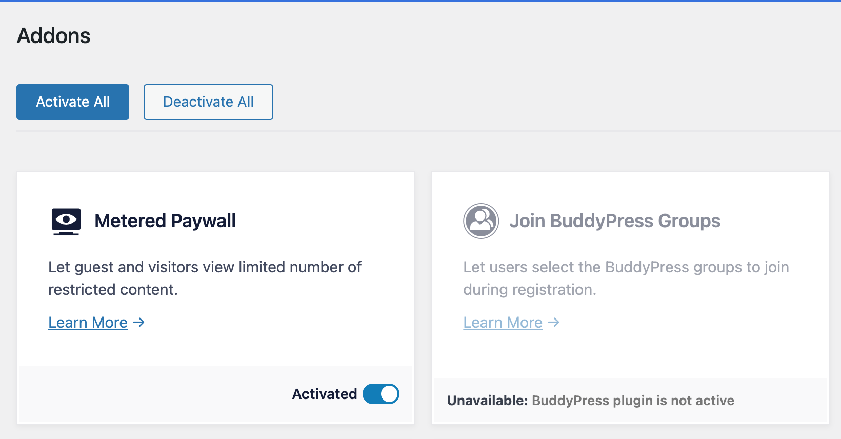 Navigate to your WordPress dashboard >> ProfilePress >> Addons to enable the Metered Paywall addon.