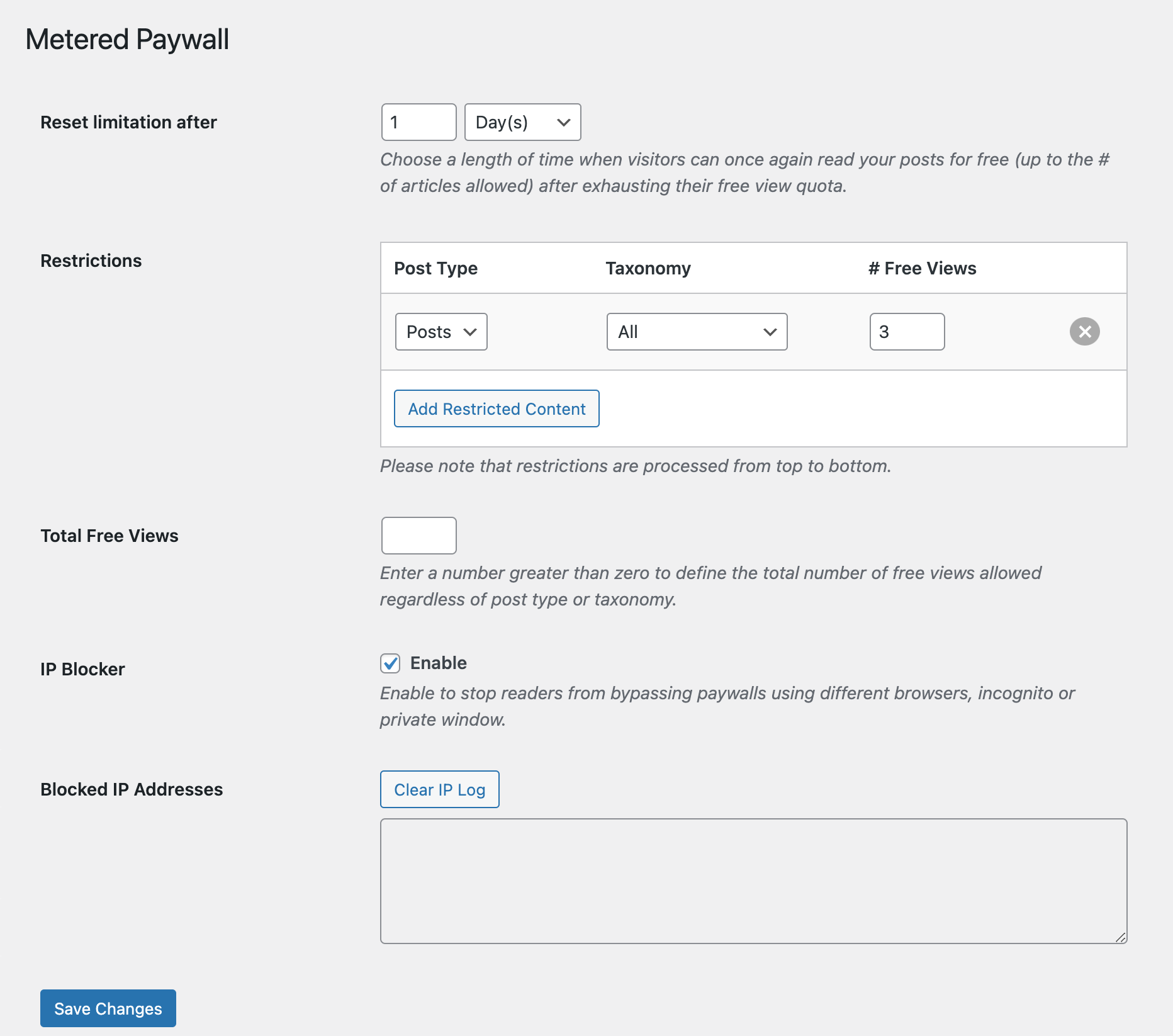 Use the Restrictions section to define the WordPress post types and, optionally, the taxonomy to make available for free viewing and the number of free views to grant to users.