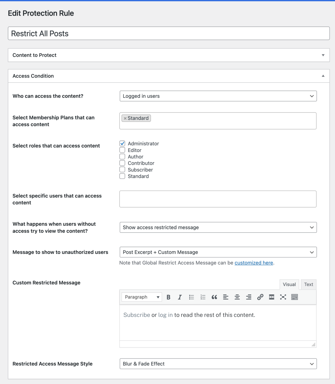 I selected the “Blur & Fade Effect” as the Access Message style to give the end of the post excerpt a blurring/fading effect.