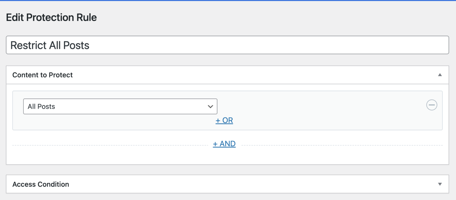 In the “Access Condition” section, you define who can access all your WordPress posts. For this setup, it’s limited to logged-in users with an active subscription to the Standard plan.