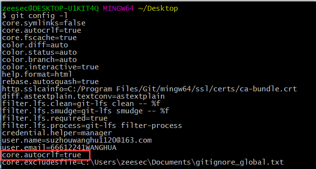 查看开发机器是否配置了 core.autocrlf:git config -l,我的机器是Windows系统,默认是 core.autocrlf=true,如下图: