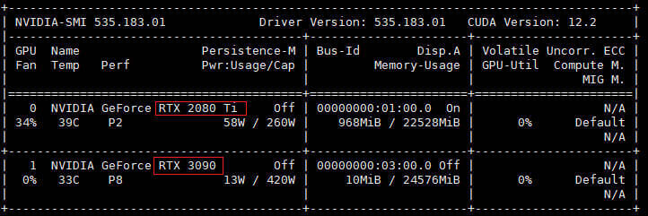 上面的 device_ids 指定了这个容器使用哪块显卡,我的主板上插了两块显卡,分解对应 deviceId 0 和 1,如果 device_ids 设置了没有的显卡,容器会起不来: