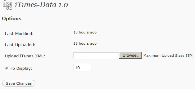 Displays data from an itunes xml file as a sidebar. Blog administrators can upload a zip file or a stand alone xml file for parsing.