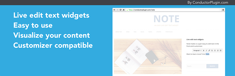 Note is a simple and easy to use widget for editing bits of text, live, in your WordPress front-end Customizer. Add Notes into any sidebar to visualize how your copy will appear within the unique layout and design of your website.