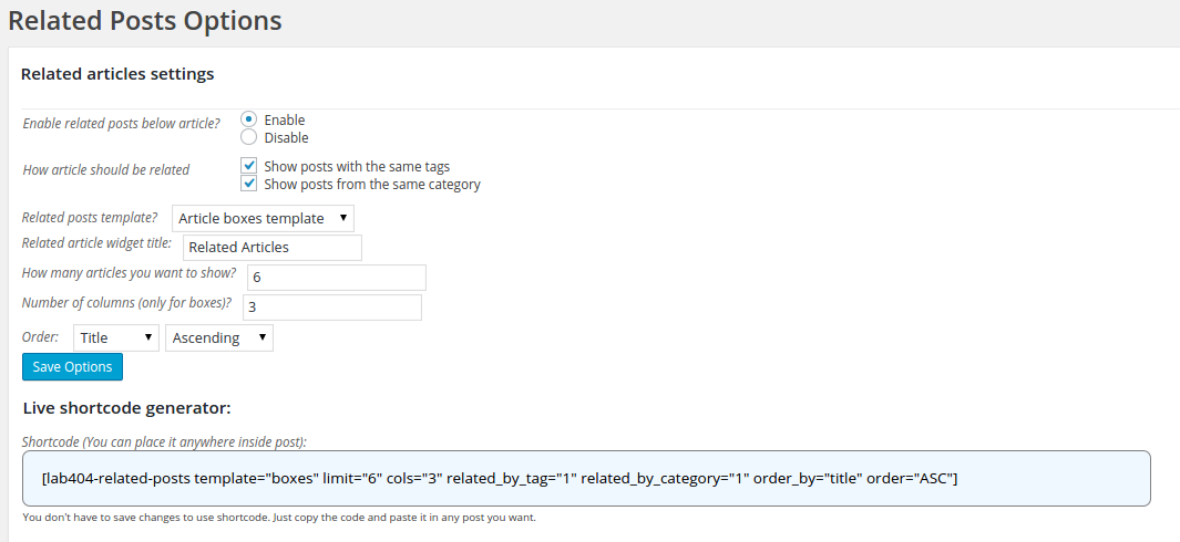 - Shortcode generator (you can use shortcodes to show related posts anywhere you want)