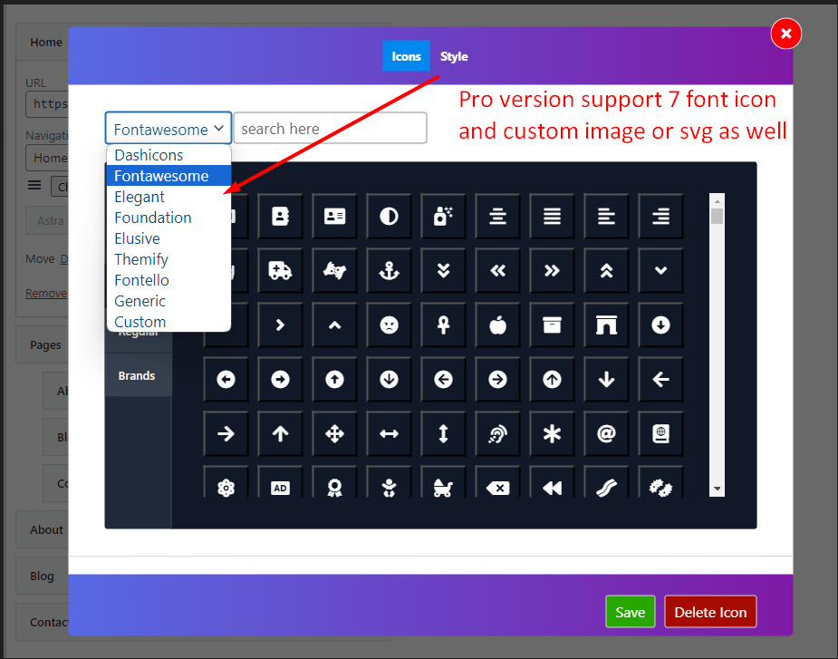 - You can use Dashicon and Font Awesome Only for free version.