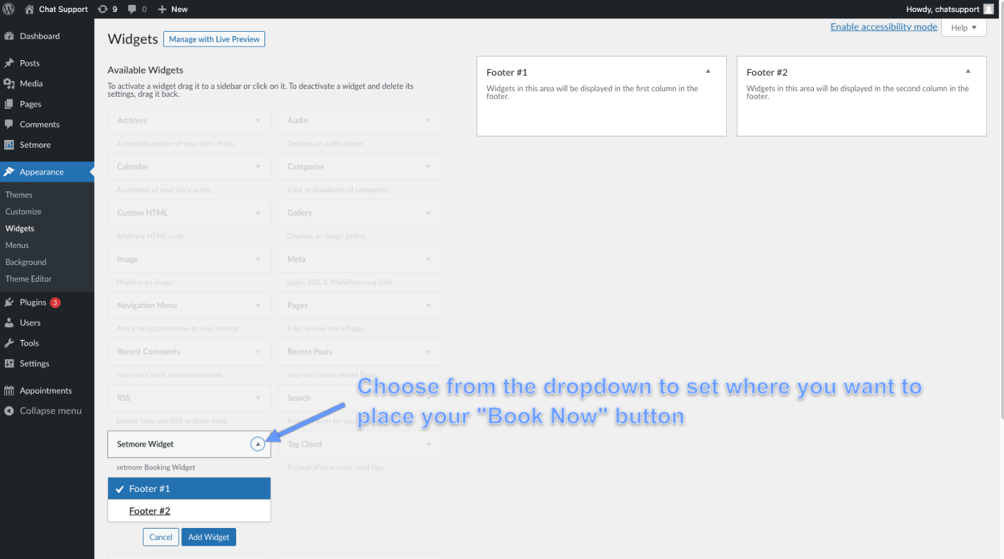 Navigate to Appearance > Widgets and find the Setmore Appointments Widget.