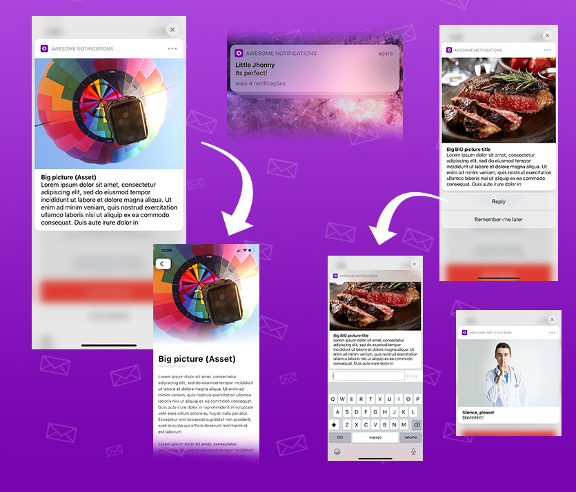 All notification types can be created locally or via remote push services, with all the features and customizations available.
