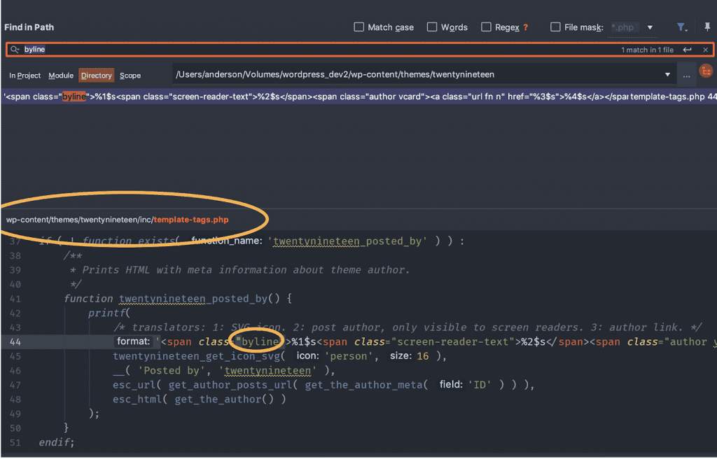Alternatively, you can use your code editor to search for “author” or “byline”. I’m using PHPStorm in the image below, and it quickly points me to the correct file: