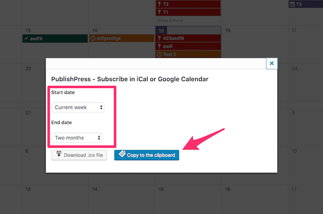 Click the link above your calendar and you'll see this pop-up. You can choose how far into the past (Start date) and how far into the future (End date) your calendar goes. You can either download the .ics file or you can copy the URL for your calendar.