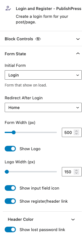 The PublishPress Login & Register is available in the PublishPress Blocks plugin. This block allows you to load a WordPress login or register form inside the block editor. You can also setup a redirect URL after login and customize the design by adding your own logo and colors.