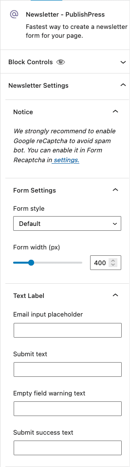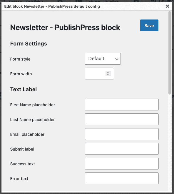 You can set default options for every PublishPress Newsletter block added to your site. This is possible with the PublishPress Blocks default configuration feature and it allows you to create a consistent look-and-feel for all your newsletter forms.