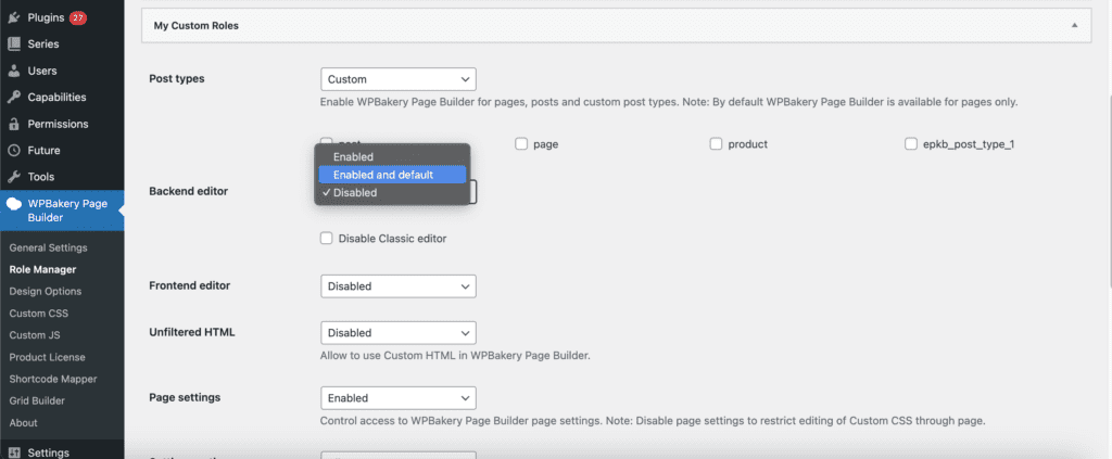 To solve this limitation, navigate to the WPBakery Role Manager and ensure that both the backend and frontend editors are enabled for your custom role.