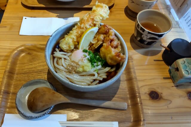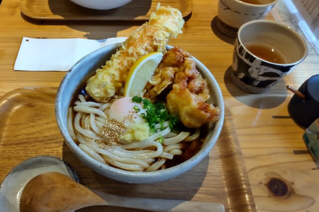 とり天と鯛ちくわ天と温玉ぶっかけ(1250円)を