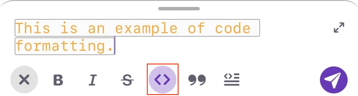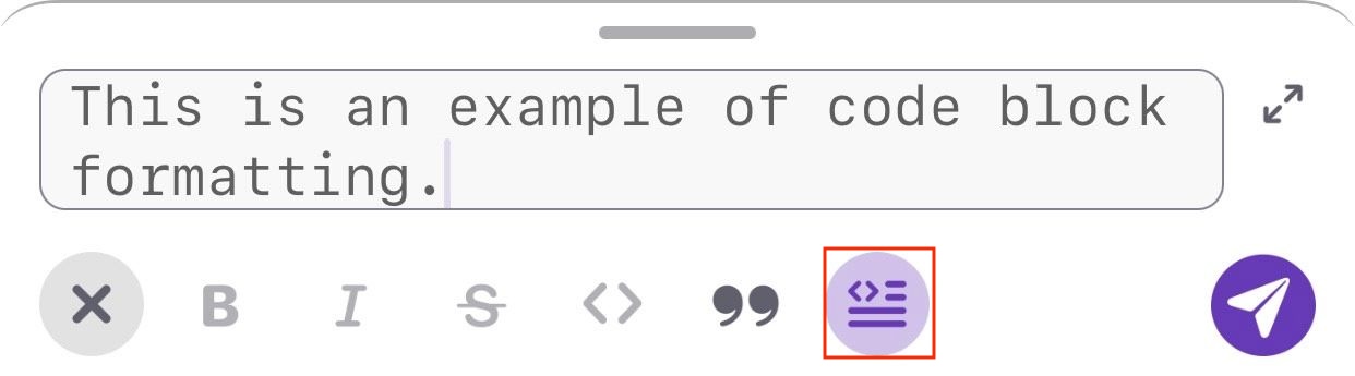 Um einen Text als Code zu formatieren, solltest du auf die Aa-Schaltfläche und dann auf die Formatierungsschaltfläche in der Toolbar unten rechts tippen und die Code-Formatierungsoption wählen. Wenn du jetzt einen Text ins Nachrichtenfeld eingibst, wird dieser in der ausgewählten Code-Formatierungsoption angezeigt.