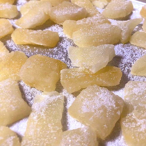 6.少し固くなったら火をとめて、トレイに移して冷まします。あとはお好きな固さになるまで乾燥させて、グラニュー糖をまぶして完成。