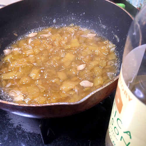 3.そのまま極弱火で水分が飛ぶまで煮つづけます。焼き色がつかない程度の弱火です。