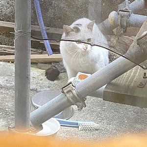 シロちゃん、ニャーすけの友達かと思いきやニャーすけの姿はどこにもなく、水やおやつを容器に入れてもビクビクしまくってて近寄りません。