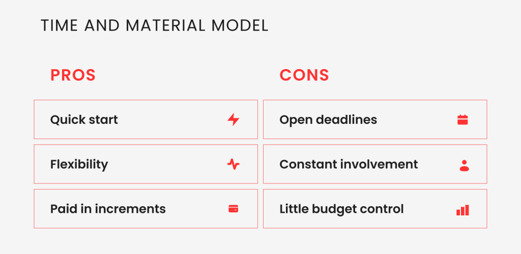 - Fast and easy start. The T&M pricing model usually involves specialists the vendor already has available, so the project can be launched quickly and at no extra cost of hiring or onboarding for the client.