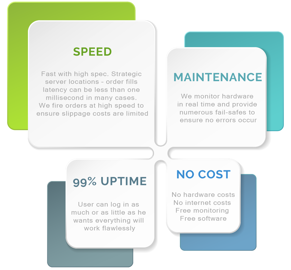 The servers have 99.9% uptime. We have backup servers for each user. Please keep in mind our systems are day trade only. Our technicians will monitor the server hardware for you each and every day at no cost.