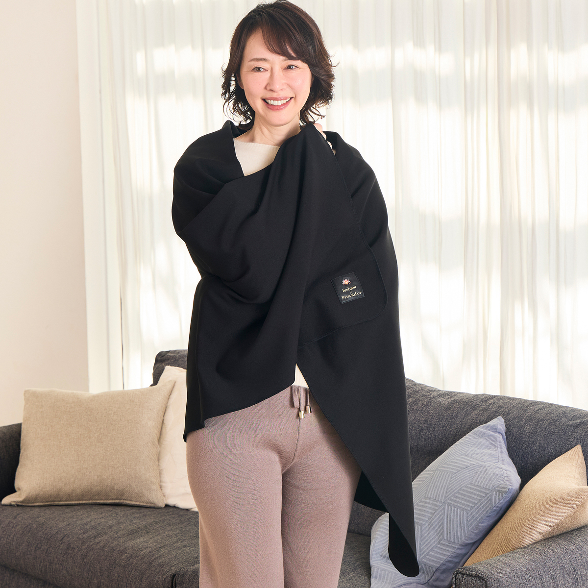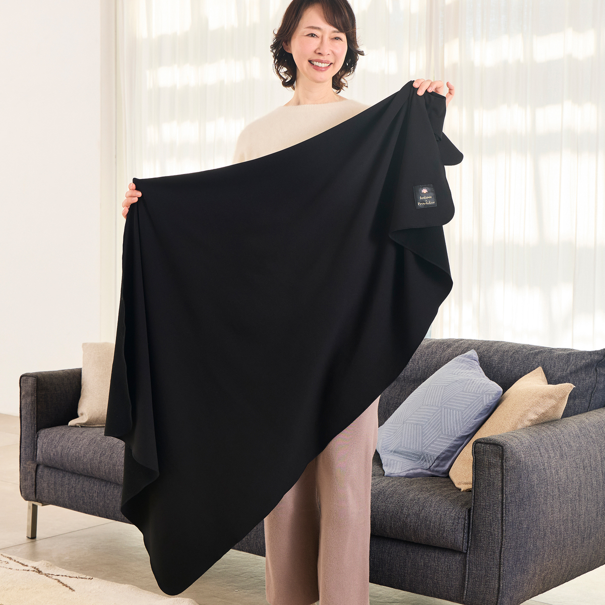 約150cm×85cmのサイズで、寝室やリビングで足元を温めたり、ストールとして上半身を包んだりと幅広く活躍。折りたたんでもかさばりにくく、オフィスやアウトドア、スポーツ観戦など持ち運びにも便利です