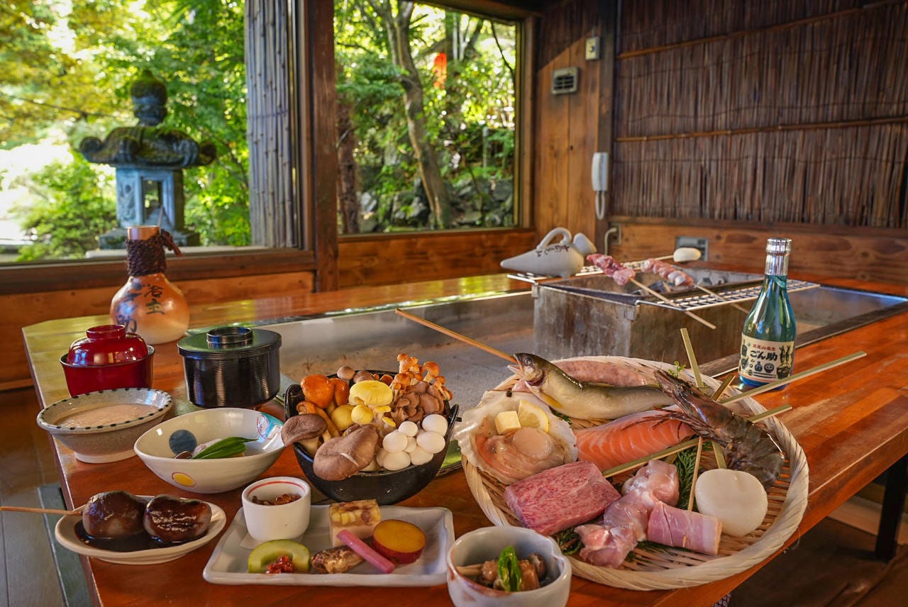 自然に囲まれ囲炉裏焼き